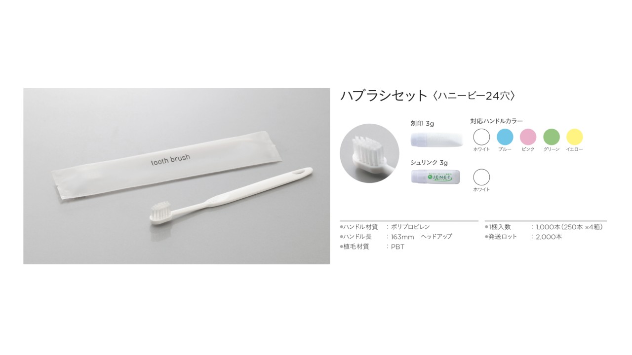 歯ブラシセット〈ハニービー24穴〉] ハンドル材質 ポリプロピレン ハンドル長 163mm ヘッドアップ 材質 PBT 1000本(250本×4箱) 2000本